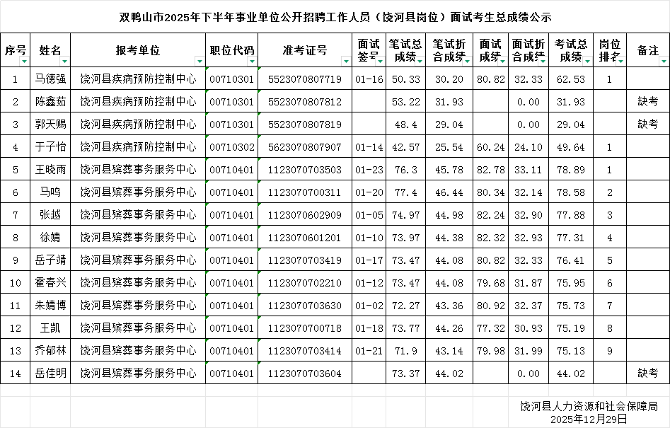 双鸭山市2025年下半年事业单位公开招聘工作人员(饶河县岗位)面试考生总成绩公示