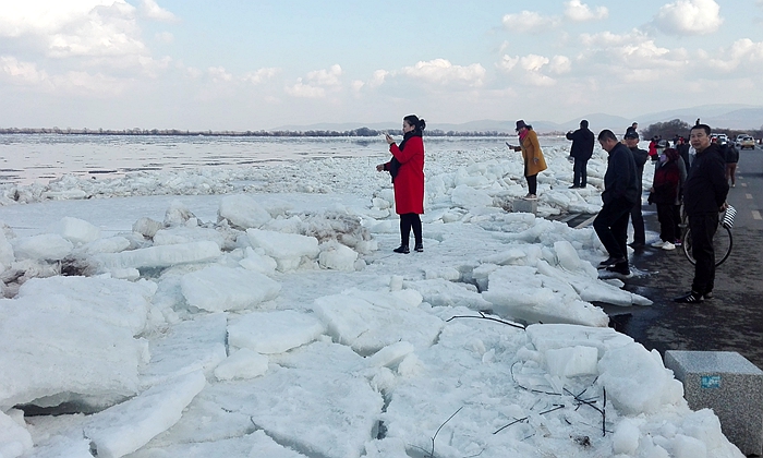 跑冰排是每年开江时节的一大景观,站在江边,放眼望去可以看到大大小小的冰排伴随着江水从上游而来,漂流而下,互相摩擦碰撞发出阵阵地声响,犹如一曲动听的交响乐。每年开江跑冰排的景象都会吸引群众前来观看,他们一边观看壮观的开江美景,一边用手机记录美丽的瞬间。